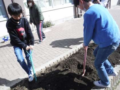 土おこしをした後にジャガイモの種イモを植えました!土がふかふかになりました。優しく植えて収穫を楽しみにしていました。