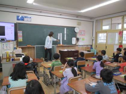2年生のときに一緒だった先生と再会して嬉しそうな子どもたち。