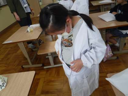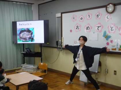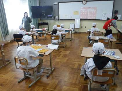 今年度の給食が始まりました。栄養教諭のS先生からおいしい給食を作ってくださる調理員さんのことや給食の大事なことをお話してもらいました。