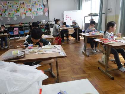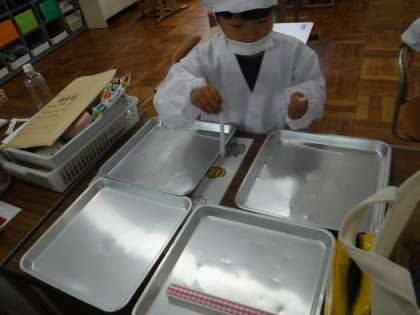1年生は、ドキドキしながらエプロンを着て自分の仕事をしました。「いただきます!」と大きな声で言った後はパクパクきれいに食べました。
