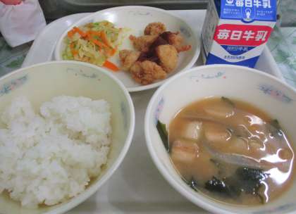 ごはん 牛乳 チキンカツ ソテー みそ汁 でした。