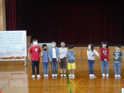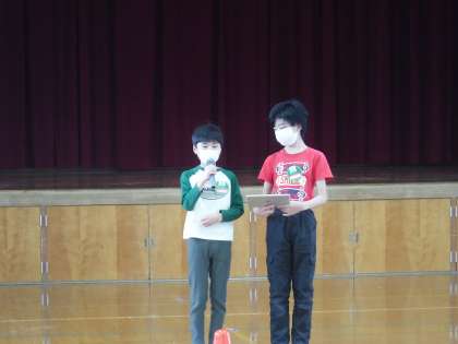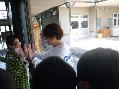 今日は、上賀茂小学校で北上支部育成学級8校が集まって「みんなよろしく大会」をしました。6年生は、初めの言葉を担当して大きな声で立派でした。今年、上賀茂小学校に異動された先生が休み時間見に来られました。「わあ!先生!」とハイタッチしていました。
