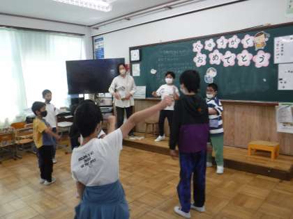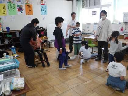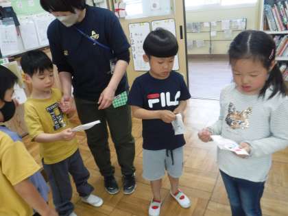 「もうじゅうがりに行こう!やおちたおちた!「」のゲームを考えてしました。プレゼントは、2年生が去年育てた朝顔の種を毎日コツコツ集めてたのを3人それぞれが好きなものを描いた袋に入れてプレゼントしました。「わあ!ねこちゃん!」と嬉しそうでした。