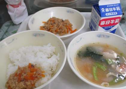 ごはん 牛乳 ツナそぼろどんぶりの具 トマトだご汁 でした。
