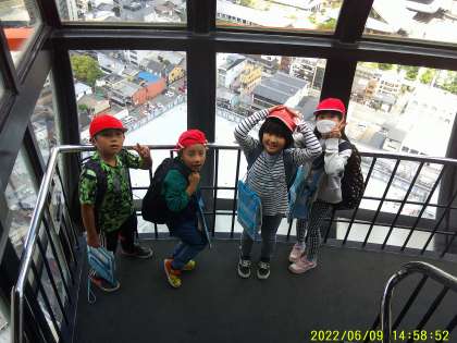班のリーダーには、方位磁針を持ってもらい、どの方角にどんな建物があるのかを班で話し合いながら展望台を楽しんでいました。