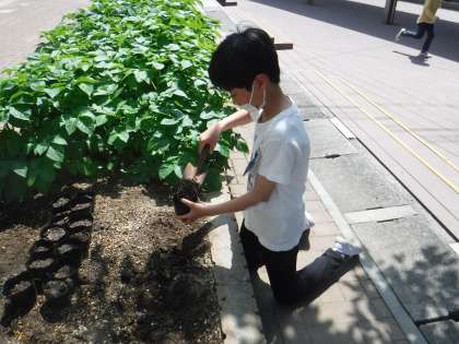 ポップコーンができるトウモロコシの種をまきました!「イエローポップ」という種類です。みんな楽しみにポットに種をまきました。