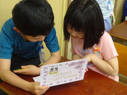 自己紹介をし合い、学校探検への招待状とあさがおの種をプレゼントしました。