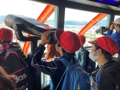 ワクワクで展望フロアへ行き、広い窓から見たり、パネルや双眼鏡を使ったりして土地や建物などについて調べていました。