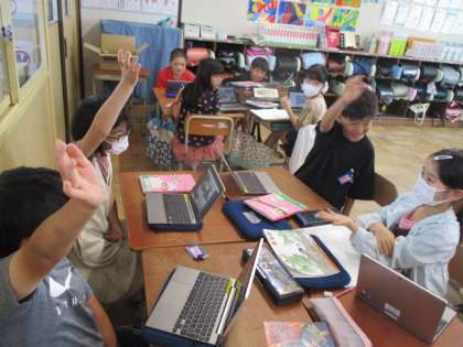 タブレットで撮った好きなものや宝物の写真を見せあいながら、友だちのすきなものについて話を聞き、さらに詳しく知るために質問をしました。