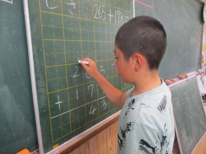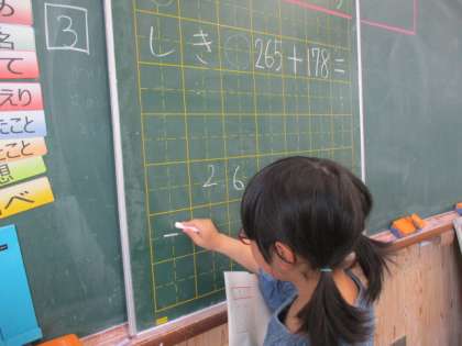 2年生で学習したことを思い出し、位をそろえて書く、一の位から計算する…など、ルールを確かめながら3けたのひっ算を始めています。