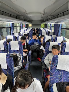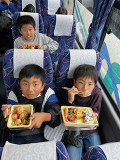 雨なのでバスで昼食。お腹が空いていたようでおいしそうなお弁当をすぐに食べていました。