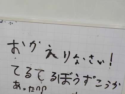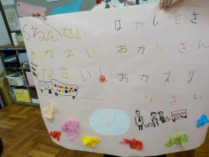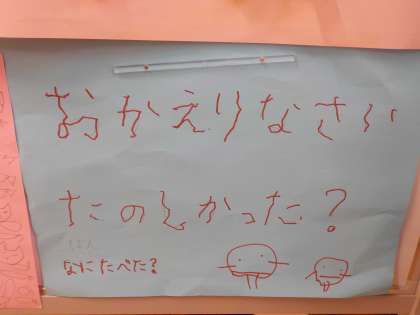 「おかえりなさい」と直接伝えられないことを話すと「おかえりなさいって書いておく」とみんなで考えました。