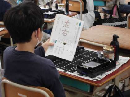 書写では筆順や字形に気を付けながら、「左右」の練習をしました。書く前の筆順の確かめでは、「左は横から!」と自信満々の様子で書き方を伝える子どもの姿も見られました。そして、教科書をじっと見て字形を確認する様子も…!今日は練習でしたが、次回、どんな作品が出来上がるか楽しみですね。