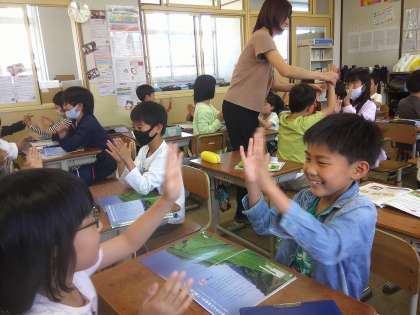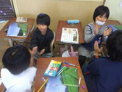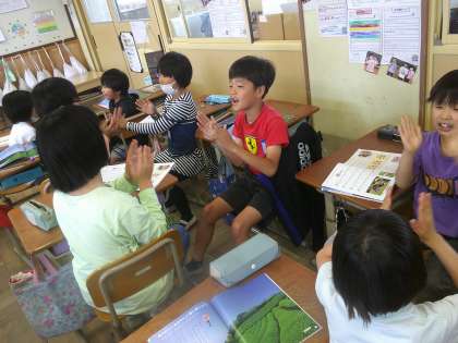 音楽の授業の中で「ちゃつみ」の音楽に合わせて歌ったりペアでリズムをとったりしました。