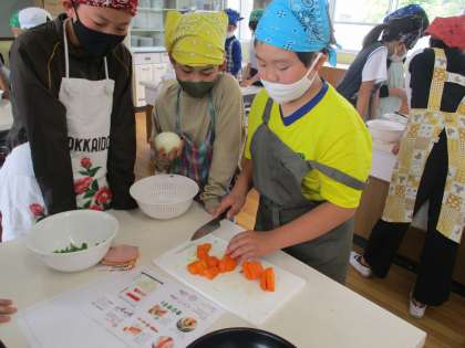 かたい人参も大きさをそろえて切り、しっかりと炒めることで、どの班もおいしい野菜炒めをつくりことができました。