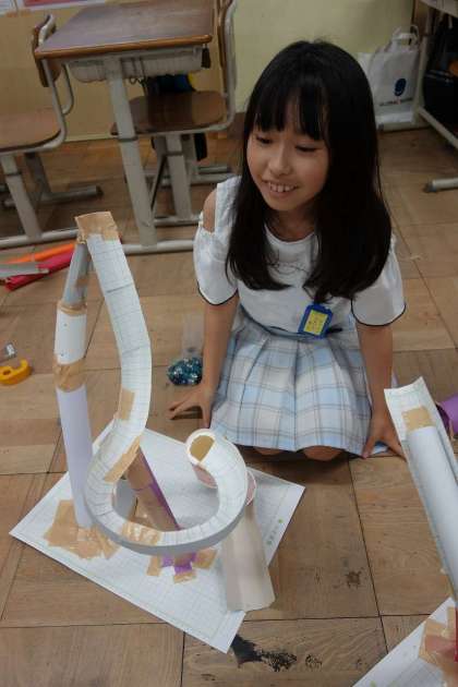 コロコロガーレの制作がいよいよ大詰めです。作品が高くなるにつれバランスが崩れだして、補強が必要になってきます。支柱を加えたりガムテープで固定したり、子どもたちなりにいろいろな工夫をしています。ひと通りコースが完成したら飾りをつけたりアーチをつけたりしていきます。
