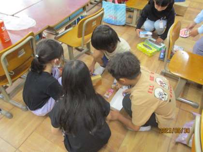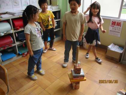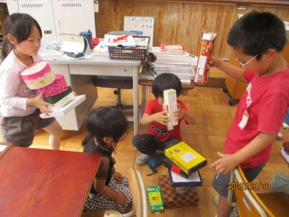 お家で用意していただいた箱や缶を使って、形の特徴を捉えながら積み上げました!!