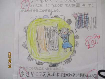 近くの公園へ行きました。公園にあるものを見つけてから、公園と仲良くなるために遊びました。学校に帰ってから思い出して、絵や文にまとめました。