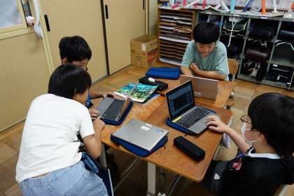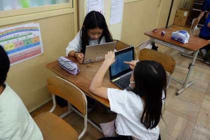 総合的な学習の時間に、手話について調べ学習をしています。この日はこれまでに調べてきたことを発表するための準備をしました。発表形式は自由で、画用紙を用いる子どもやタブレットを使う子どもなど、様々です。一緒に活動する友達と案を出し合い、楽しんで学習していました。