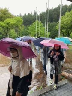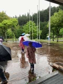 朝からの大雨に比べると今は少しマシになりました。でも、ハイキングは中止になりました。なので、プレイボールで活動することになりました。