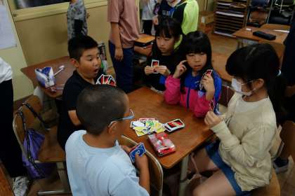 今日はあいにくの雨で、子どもたちは外で遊ぶことができませんでした。ですが、大宮小では雨の日に室内で遊ぶカードゲームやボードゲームが各クラスに用意されています。みんな仲良く譲り合いながら使えています。この日は男女が一緒にカードゲームをする姿もいられました。とても微笑ましいです。