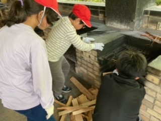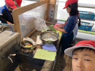 野菜を切って、お米を研いで、薪を準備した、みんなで頑張っています。