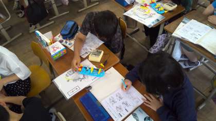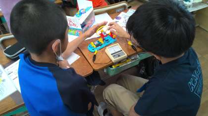 理科「電池のはたらき」の学習では、電池の数やつなぎ方によってモーターの速さや豆電球の明るさはどのように変わるかを確かめています。つなぎ方を変えてモーターを回してみると「ゆっくりになった!」など驚きながら取り組んでいる様子が見られました。これからも、子ども達の気づきを大切にしながら、学習を進めていけたらと思います。