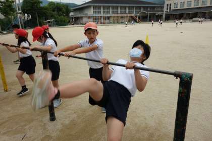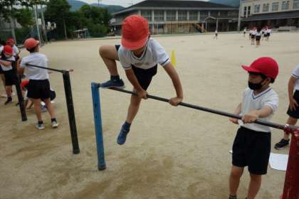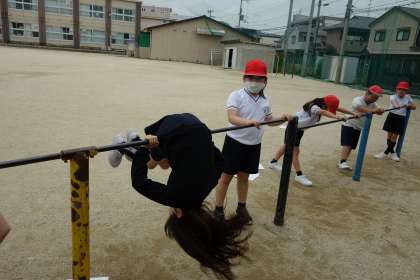 まずは、順手で鉄棒を握ることや、親指を下に回すこと、絶対に手を離さないことなど、安全に学習できるよう指導しました。これから、お互いに尋ねたり教えたりしながら、ともに磨き合えるような学習になればと思います。