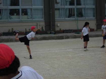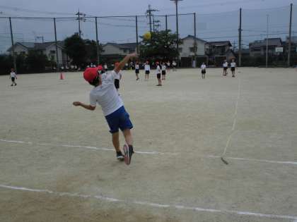 遠投の学習では、「どうすれば遠くに投げられるか」を考えながら活動しました。子ども達からは、視線や足、体の向きなどの気づきがでました。中には、「もうちょっと上を見て、あの電灯のところに向けて投げるといけるで!」とアドバイスの声も!これからも皆で気づきを交流しながら取り組んでいけたらと思います。