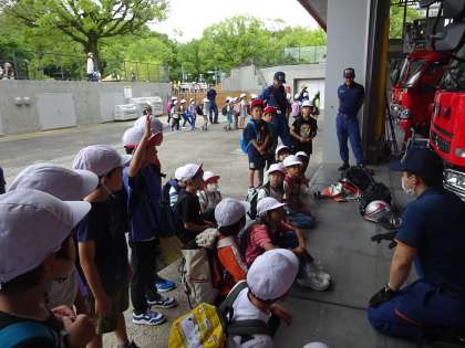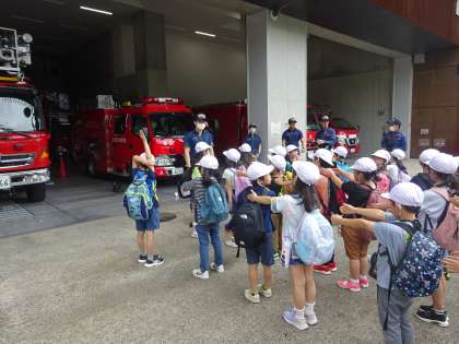 消防署の見学は、実際に消防車の中を見せていただき大喜びしていました。