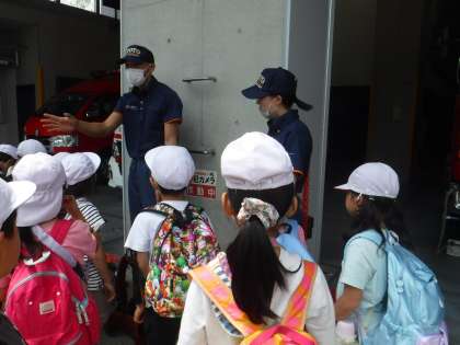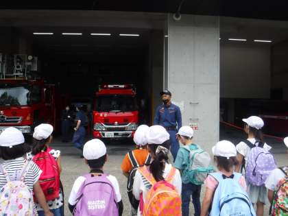 普段見られない消防署の中を見せていただきました。近くで見られて「おおきい!」と嬉しそうでした。