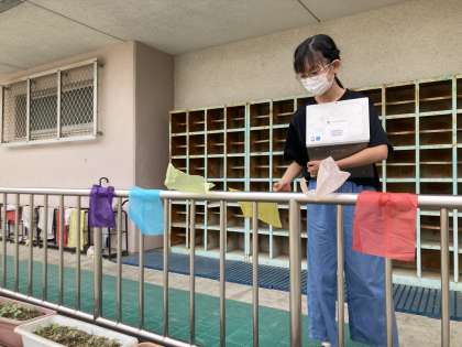 手すりにテープや紙をつけたり、ティッシュをとばしたりしていました。