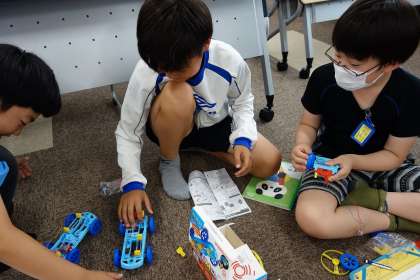 理科では電池のはたらきの学習で、モーターを使った実験をしてきました。学習の最後に、モーターを使ったおもちゃを作って遊びました。回路のしくみを理解して、しっかりと組み立て、楽しく遊べました。