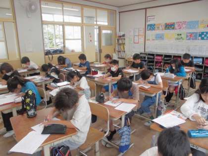 国語科の学習では、手紙の型を学び、それを活かしながら気持ちが伝わる手紙を書いています。今日は手紙の清書をしました。教室の中はえんぴつで文字を書く音だけが響いていました。集中して、お礼の気持ちを込めながら丁寧な字で書くことができました。