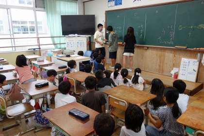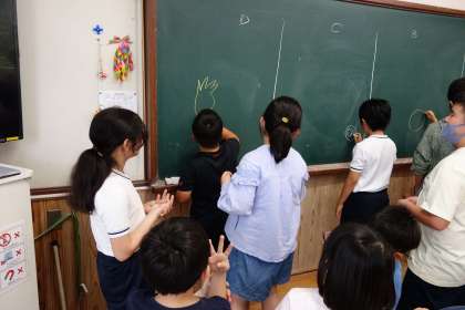 月に一回あるたてわりで遊ぶ日です。1年生から6年生が集まったグループで、教室や運動場で遊びます。まだぎこちないところもありますが、6年生が盛り上げてくれています。今日は黒板を使って、絵しりとりをしました。4年生も1,2,3年生を楽しませられるようになってほしいです。
