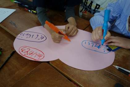 最後には、教室で交わし合いたい心地よい言葉「ふわふわ言葉」をグループで考えました。教室の前に掲示し、いつも目に触れさせながら、温かい言葉を交わし合える仲間になってほしいと思います。