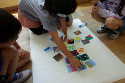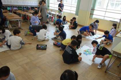 子どもたちは、ぐるぐる模様は生き物の心臓に見えるようです。また、しましま模様は宇宙の惑星に見えたようです。お互いの感性を持ち寄り、子どもたちの頭に想像を超える世界が広がっていたのだと思います。