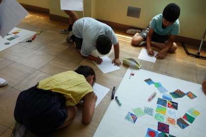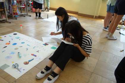 最後にお互いのグループの作品を見合って鑑賞をしました。生き物に見えたり宇宙に見えたり、海底に見えたり、その想像力をお互いに楽しんでいました。