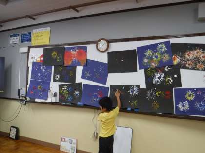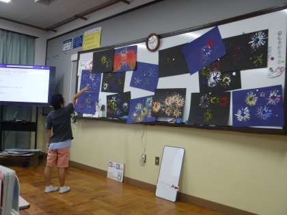 作品鑑賞を楽しみにしている子どもたちです。「きれいな色のところがいい。」「火が燃えてるみたい!」と自分の作品についてや友だちの作品を見てもたくさんの感想が出てきました。
