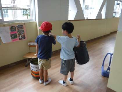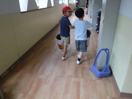 1年生二人が声をかけあってゴミ捨てに行きました。掃除が始まると何も言わなくても自分たちで役割を相談して決めてやり始めています。
