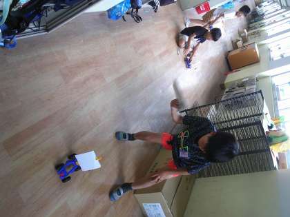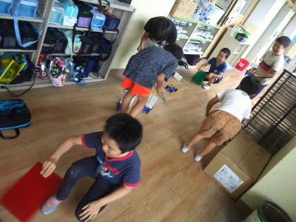 自分たちで作成した車に帆を立て、下敷きで風を送ったり、勢いよく息を吐いたりして車を楽しそうに動かしていました。
