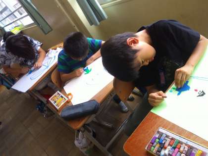 傘を持った自分を描いていくのですが、子どもたちは思い思いの傘や背景を思い浮かべながら取り組んでいます。