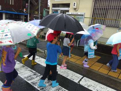 「商店のはたらき」では、スーパーマーケットでたくさんの人が買い物をする理由を探るために、各自インタビューしたいことを考えて雨の中歩いていきました。