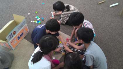 集めていただいたつつやキャップなどで,どんな遊びができるかためしたり工夫したりして楽しく遊んでいます。