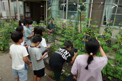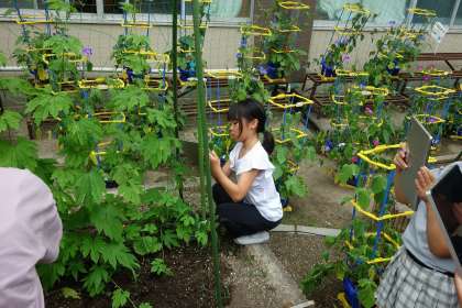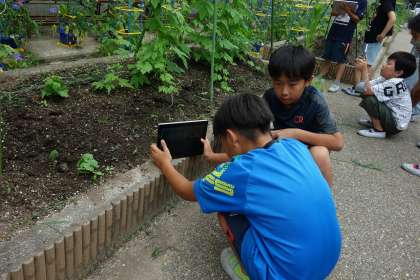 理科の学習で、ツルレイシの観察をしています。継続的に観察することで、植物の変化について考えています。「大きくなってる!」という驚きとともに、近くで写真を撮ったり全体を撮ったりしていました。