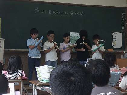 表現の工夫を考え、グループごとに工夫を意識して練習したことを全体の場で発表し、お互いに感想を言い合っていました。