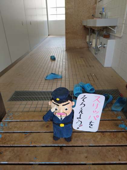 トイレにはみまわりのおじさんがいます。トイレのスリッパが乱れると、すのこにこのおじさんが現れます。すると子どもたちは自然とスリッパをそろえておじさんを元の場所に戻してくれます。スリッパを乱した子どもにも、この気持ちよさが伝わってほしいです。