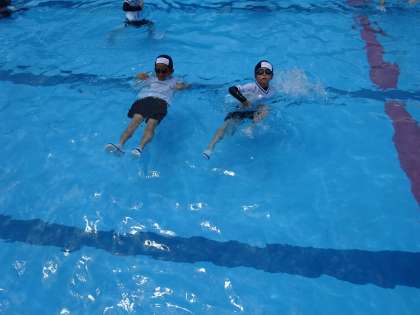 ペットボトルを持っての救助されるまでの浮き方やおぼれている人がいたら浮くものを投げるなど教えてもらいました。