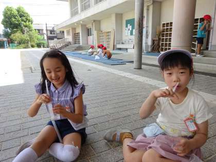 どんな息で吹きかけるといいのかな?シャボン玉ってよく見るといろいろな色が混ざっているね。と子どもたちの大発見、すごい!!