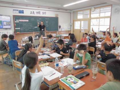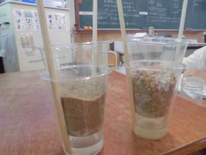 理科の学習では「水は地面にしみこむのだろうか」という学習問題を実験し考えました。校庭の土と砂場の砂の、土のつぶの大きさの違う二つを比べて実験しました。実験が終わってからも、なぜこのような結果になるのかということまでしっかり考えることができました。